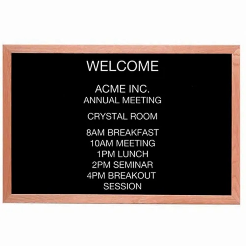 This Classic black felt covered board with an attractive oak frame is precision grooved on 1/4" centers to accept our universal quick change letters to create your own sign in minutes or change to suit your needs. One free set of 3/4" Helvetica letters and