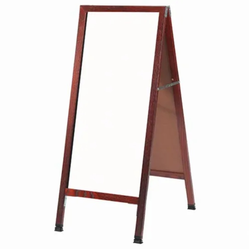 A-Frame Sidewalk White Marker boards make great Menu Boards or POP signs that broadcast messages effectively. The frame is solid oak wood with a cherry finish and features steel reinforced corners, weather resistant hardware, a unique camel foot floor leve