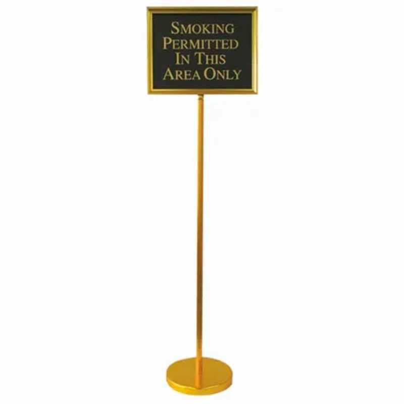 This sturdy and attractive sign is constructed with a single piece extruded aluminum post and weighted base with rubberized floor guards. Unit has a 54″ over all height and has a 15″W x 12″H sign frame. 12 signs that conveniently store inside the frame are included. Color Gold