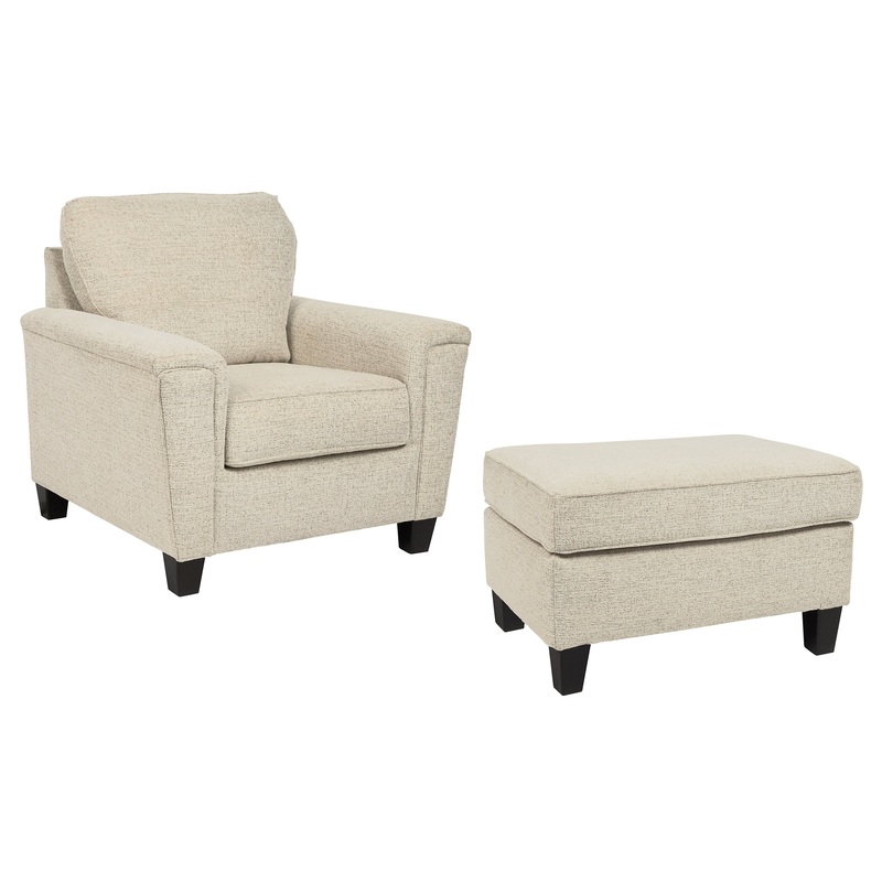 If youre looking to lighten the mood, youre sure to find this space-conscious, budget-conscious chair a breath of fresh air. Covered in a cream-tone chenille upholstery loaded with plush texture, this less-is-more contemporary chair is dressed to impress with angled side profiling and track armrests wrapped with a layer of pillowy softness for that little something extra. Talk about one sensational look. Matching ottoman included.