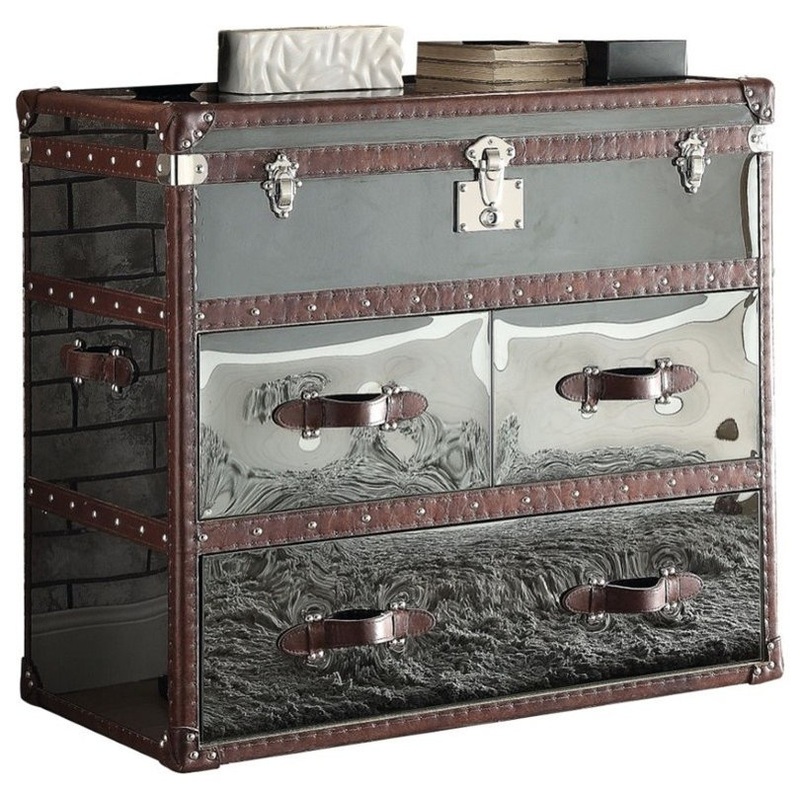 The Aberdeen collection combines different materials to bring an undeniable sensation to any living room. This sofa table features a trunk like design with stainless steel top and side panels, vintage dark brown top leather trim edging, single leather handle on each side, and three Felt-Lined drawers. This unique design is sure to transform your home with storage and style.