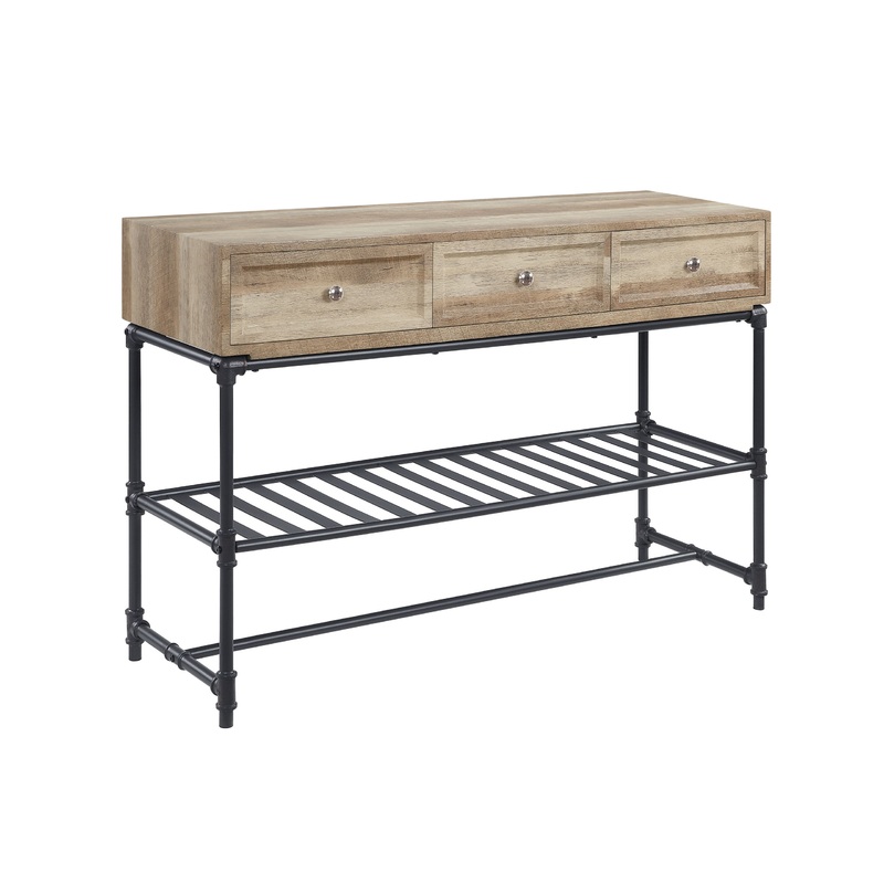 Put an industrial design spin on your entryway or living area with this charming three-drawer console table. Perfect for stashing keys, remote controls and anything else you can imagine, the table delivers three roomy drawers and a long, narrow tabletop, all showcasing a cool oak wood finish. The table frame includes a lower shelf and a sandy black finish that highlights its industrial pipe-inspired design. A lower shelf adds well-spaced slats to lighten the overall look and its modern farmhouse character.