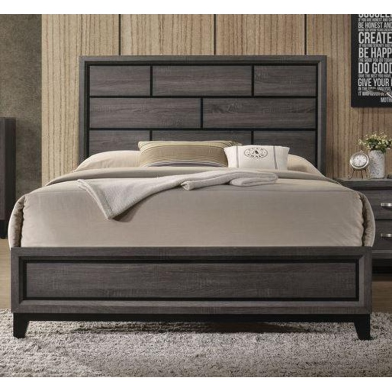 Valdemar Collection by Acme Furniture Weathered Gray finish Grooved headboard Low profile footboard Raised trim Recessed panel Wood tapered leg This bed requires a boxspring Also available in Queen