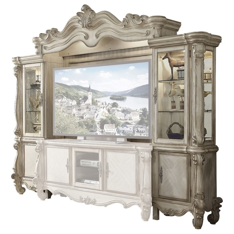 Description: The Versailles the entertainment center was inspired by old European design. This collection features carved scrollwork accent on the bridge's crown. The collection pieces are carefully crafted with selected wood and veneers in bone white fini
