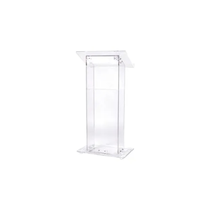 These contemporary designed Podium / Lecterns are made from 1/2" and 3/8" acrylic plexi glass. Very popular in any modern business setting that calls for an attractive and unique looking podium. Clear finish. 24"W x 15"D x 46"H overall.