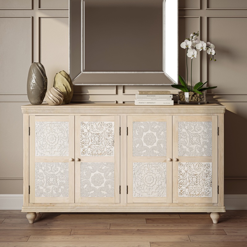 Our Accent Cabinet is a testament to the beauty of meticulous craftsmanship. Every intricate detail on this cabinet is hand-carved by skilled artisans, ensuring that each piece is unique. The carved elements include ornate motifs, geometric patterns, and floral designs that add a sense of sophistication to your interior.