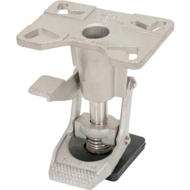 This floor lock offers adjustable heights to take up slack as wheels wear down, or make up for varying height differences when multiple casters are used on the same cart. Unit keeps working properly as spring and pad wear over time. Conveniently located foot pedal locks and releases easily. Bottom pad has a suction-cup surface for extra grip. Rust-resistant stainless steel construction for food service and medical related cart applications. Floor lock is rated to lock a product with 2,000 lbs weight.
