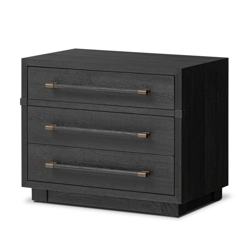 Beautifully minimalist. A three-drawer dresser made from black-finished ash features long, linear bronzed hardware for a smooth, clean look.