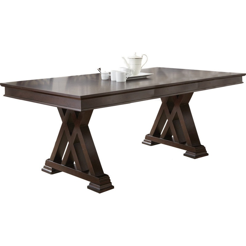 The look of the Adrian dining table is unique and modern. The table is crafted of hardwood solids and primavera veneers, and boasts a hand applied espresso cherry finish. The extra wide apron and designer interlocking "X" style base give this table it's di