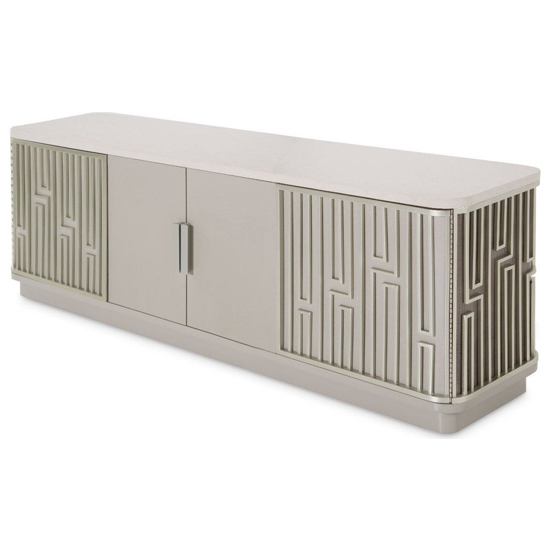 DescriptionEvery detail counts! Prop your TV and tuck away your electronics with this stunning Roxbury Park Media Cabinet. Refined style is at your fingertips! -Case front is wrapped in frost gray faux shagreen -Case sides feature wood panels with Figured