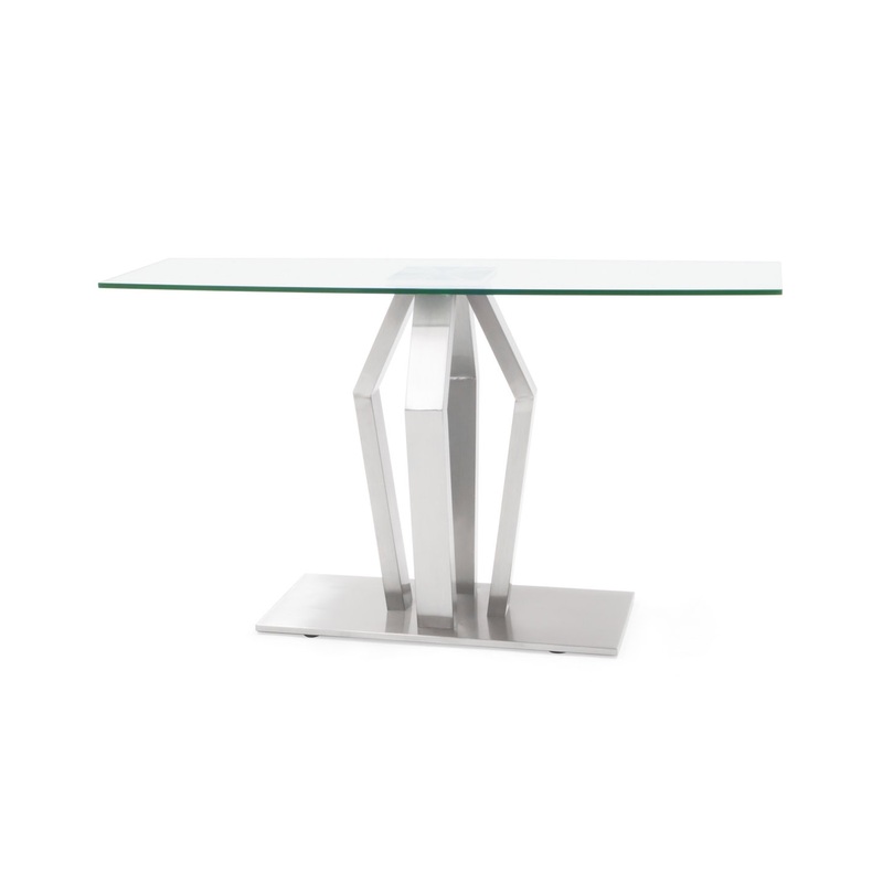 Crafted for style, the modern Aiden Console Table offers a clear fusion of contemporary beauty and sharp geometric shapes. Aiden features striking structural details with its rectangular tempered glass top with curved bow-front edge and angular brushed stainless steel base. Perfect for your entryway or pair it with the Aiden Dining Table as a mini buffet when entertaining.