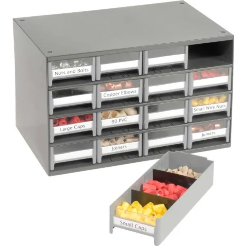 This modular 16 multi-drawer steel frame cabinet features galvannealed steel frame with a gray powder coat finish, make it rust proof, chip proof and scratch resistant. High impact styrene scoop bottom drawers with clear fronts and molded in label holder. Overall cabinet size is 17″W x 11″D x 11″H. Nesting “feet” for stable stacking. Includes two dividers and one label per drawer.