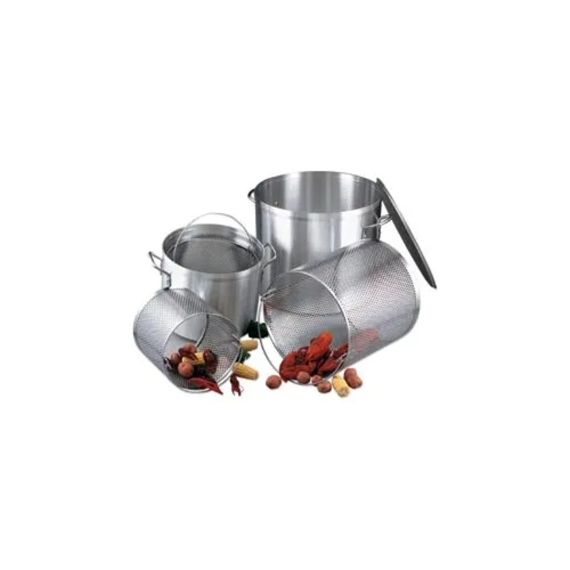 80 Qt. Stock Pot, with Lid and Basket Aluminum stockpot made of 1100 soft alloy, NSF approved with a inner metal wire basket for steaming and draining. Bail handle for removal.