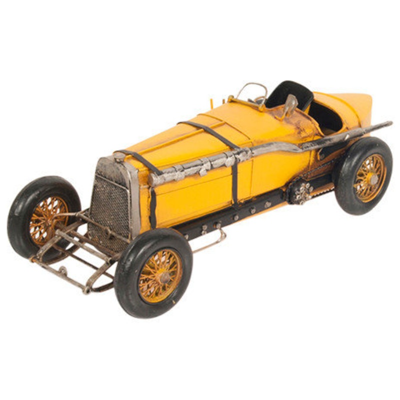 The P2 was introduced by Alfa Romeo for the Circuit of Cremona in northern Italy in 1924, where Antonio Ascari won at over 158 km/h (98 mph), and then went on to win the speed trial at 195 km/h (121 mph). The car was the first creation of Alfas new designer Vittorio Jano who had been recruited from Fiat by Enzo Ferrari when Nicola Romeo scrapped the P1 after its poor performance in the 1923 Monza Grand Prix against Fiat. The P2 was powered by Alfas first straight-8 cylinder supercharged engine with 2 carburetors placed after the compressor. Only 2 of the 6 original models survive, and they can be seen in the Alfa Romeo Museum in Arese and the Turin Automobile Museum. Our model is handmade from tin and painted in yellow color. It features many intricate details such as turnable wheels & tires, exhaust system, front wireless radiator, black painted steering wheel, and seat. It’s a great model for any office decoration or passionate car collectors. Alfa Romeo is a registered trademark of FCA Group Marketing S.p.A