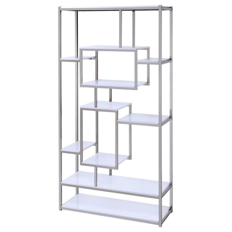 The Alize collection features stunning designs in chrome that encompass modern, artsy styling. The Bookcase shelves are constructed of faux wood Silvershield 3D Laminate in a crisp white finish, that resists heat, scratches and moisture. Staggered shelves