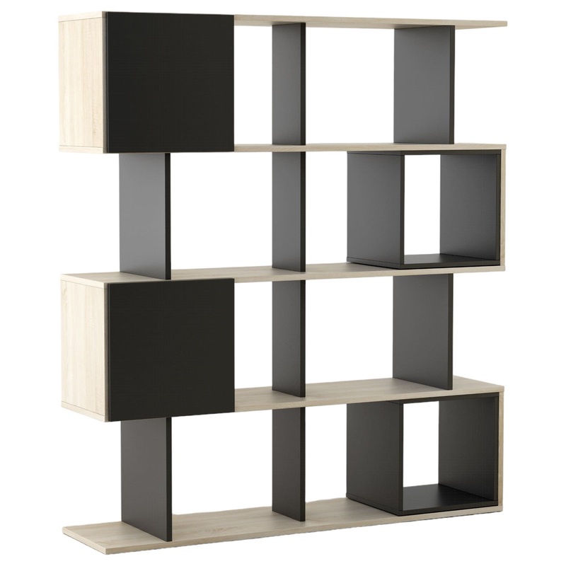 12-Shelf: With a total of 12 storage areas including two swing doors, this spacious 63″ Wide by 55″ Height Modern Geometric Bookcase is a highly functional and practical storage area space.