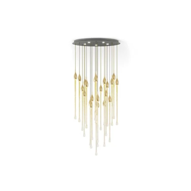 The Allure is an exquisite lamp entirely handcrafted according to traditional murano techniques. The venetian crystal colour drops (n. 22 drops and 6 spots for oval version and n. 23 drops and 6 spots for round version), positioned at different heights, are made in solid murano glass enclosing precious 24 kt gold leaf. In the gold finish, the top cap is made from brass. The top plate is anchored to a steel plate painted white.