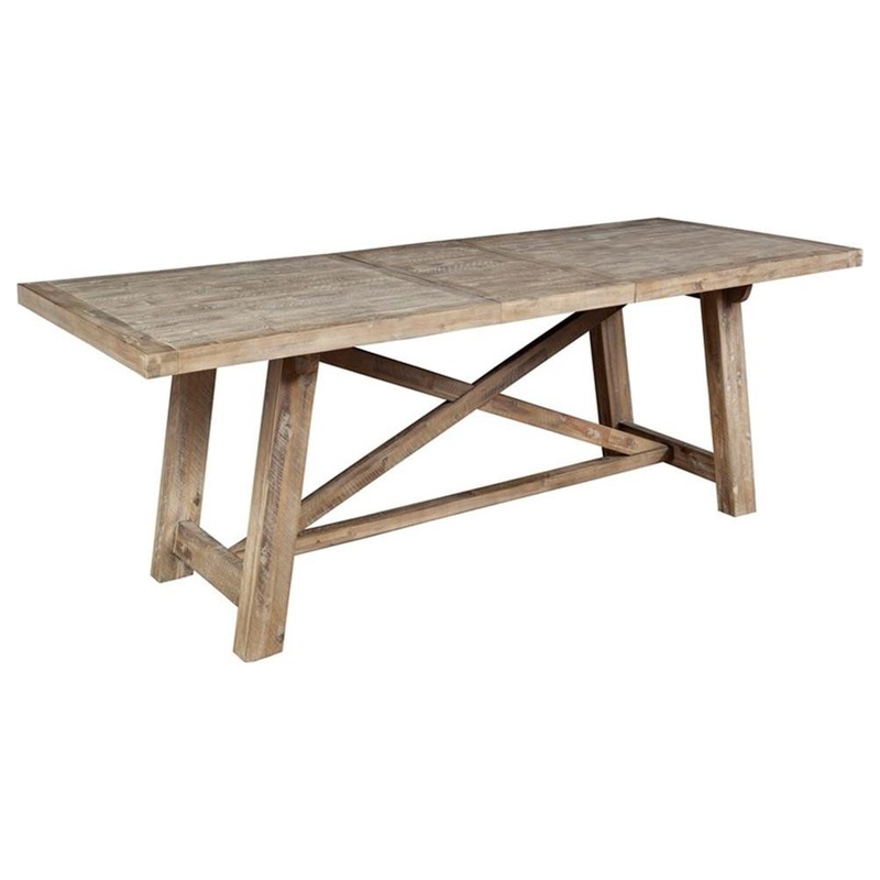 A beautiful Weathered Natural wood finish brings rustic elegance to your dining room with the Newberry Rectangular Dining Table. A removable leaf lengthens the table from 88 inches to 103 inches, making ample room to seat eight. Using sustainable wood resources, this table is constructed with Acacia wood and built with angled legs with an x-design at its base for both aesthetic appeal and stability. Designed with hosting in mind, this dining table is styled well with a combination of a bench and dining chairs sold separately. Complete the room setting with the beautiful, matching 3 drawer/3 door Sideboard, also sold separately.