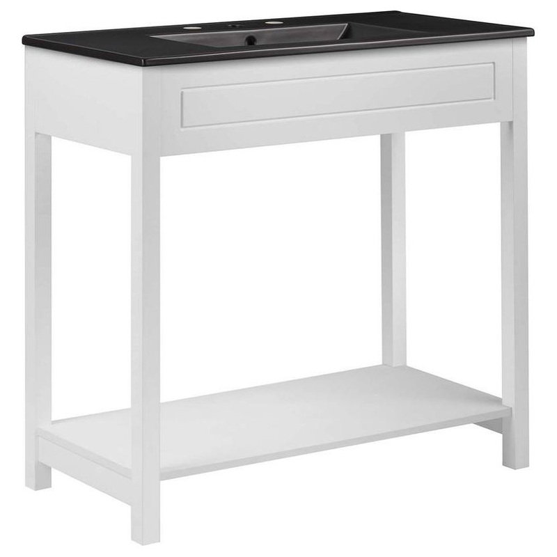 Refresh your bathroom space with the Altura 36 Bathroom Vanity. Boasting crisp, clean lines and a streamlined design, this modern vanity is durably crafted with painted MDF and particleboard and features inset detailing for subtle added interest. Complete with a ceramic sink basin with 8-inch centerset faucet holes and an integrated countertop, this vanity features a spacious open storage shelf to accommodate decor or bathroom essentials. Altura includes non-marking foot caps to protect flooring. Fixtures not included. Assembly required.