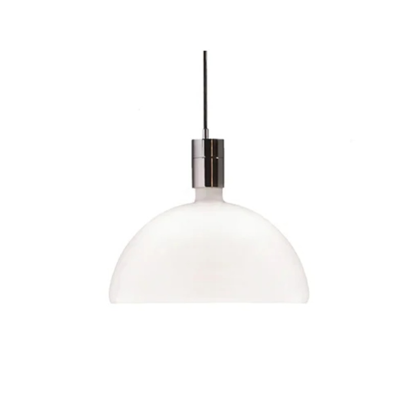 Suspension lamps with visible chromed metal components and cup-shaped lampshade in opal white glass. Diffused light. AS41C: chromed swivel and articulated arm, complete with cable lock for adjusting the length of the outgoing cable.