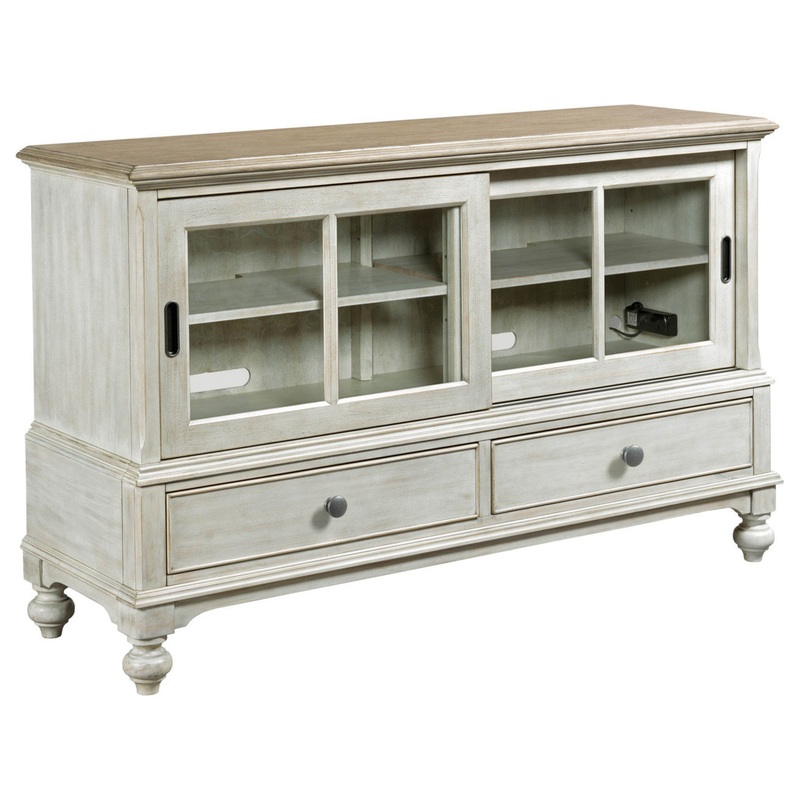 -Litchfield Collection by American Drew Furniture -2 drawers -2 sliding glass doors with seeded glass -Hand holds in back of case -Cord exits -One adjustable wood shelf behind each door -3 outlet plug behind right side door -Adjustable levelers -Center foo