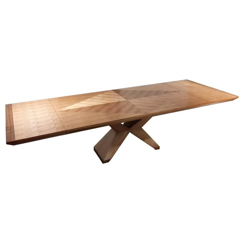 When classic dining room furnishings are a bit too traditional, turn to our collection of visually interesting and highly functional pieces. The black semi-gloss base is topped with a sleek walnut veneer top featuring a geometric design. Fully extended with leaves, this dining table opens up to 114-inches, giving you plenty of room to gather friends and family for dinner. The Angles Dining Table adds an effortless twist to your living space, and each one is created with the utmost attention to detail and superior craftsmanship.
