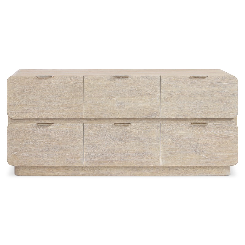 Elemental design gets a refined and modern update for the Antibes dresser. Softened corners and shapely drawer fronts have an organic simplicity with the rustic Roz finish. The case is supported with a plinth base and features six pull-to-open drawers with cast aluminum pulls.
