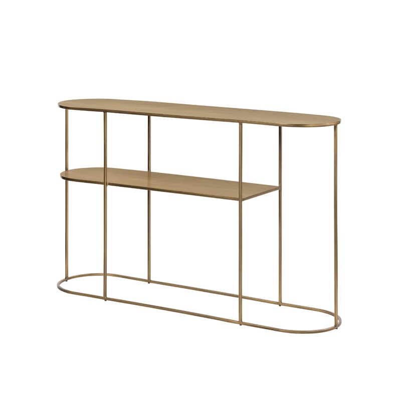 With two shelves, this console table blends both form and function, complementing a variety of interior styles, lending a clean, contemporary touch to surroundings. An openly-styled base supports this antique brass piece and a slightly roughened finish gives its minimalistic aesthetic a lovely touch.
