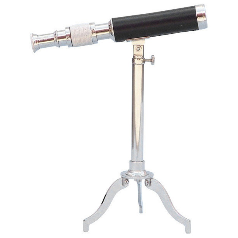 The Chrome with Leather Telescope on Stand 17 is a true nautical gem that is both fully functional and beautifully decorative, adding a warm seafaring shine to any room it graces. The stand has an adjustable knob to change and hold a specific direction. Focusing is accomplished by adjusting the eyepiece ring on the telescope tube, with up to 10x magnification, and a solid chrome cap is included to protect the lens when not in use. The chrome tripod stand features smooth, polished round legs, each with solid chrome fittings and a screw.