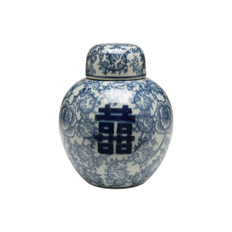 Antiqued pale green transferware porcelain with blue flower, leaf and vine design and Chinese symbol for double happiness. Lid is removable. Model # (MPN)59765Product ID101283957Manufactured ByOrchard Creek DesignsSold ByHouzzSize/WeightW 6" / D 6" / H 8"