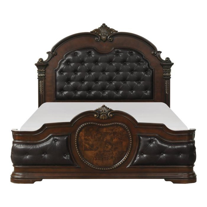 Traditional elements of Old World European styling are blended to create the look of the Antoinetta Collection. Acanthus leaf motif as well as bead and heavily carved moldings serve as the initial draw to the traditional design. Canted pilasters, sunburst medallion, and classic button and bale hardware further accent the Eastern King bed. The heavily framed headboard features dark brown bonded faux leather with crystal button tufting. Cherry veneers and burl inlay are highlighted by a warm cherry finish with gold tipping.