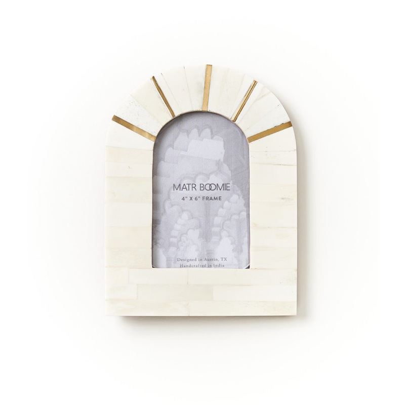 Elevate your decor with our beautifully handcrafted picture frame, featuring an elegant arch shape designed with ethically sourced, cruelty-free bone tile and sophisticated brass accents. This unique frame is ideal for showcasing your cherished 5.5×3.5 photo or print, adding a touch of artisanal charm to any room.