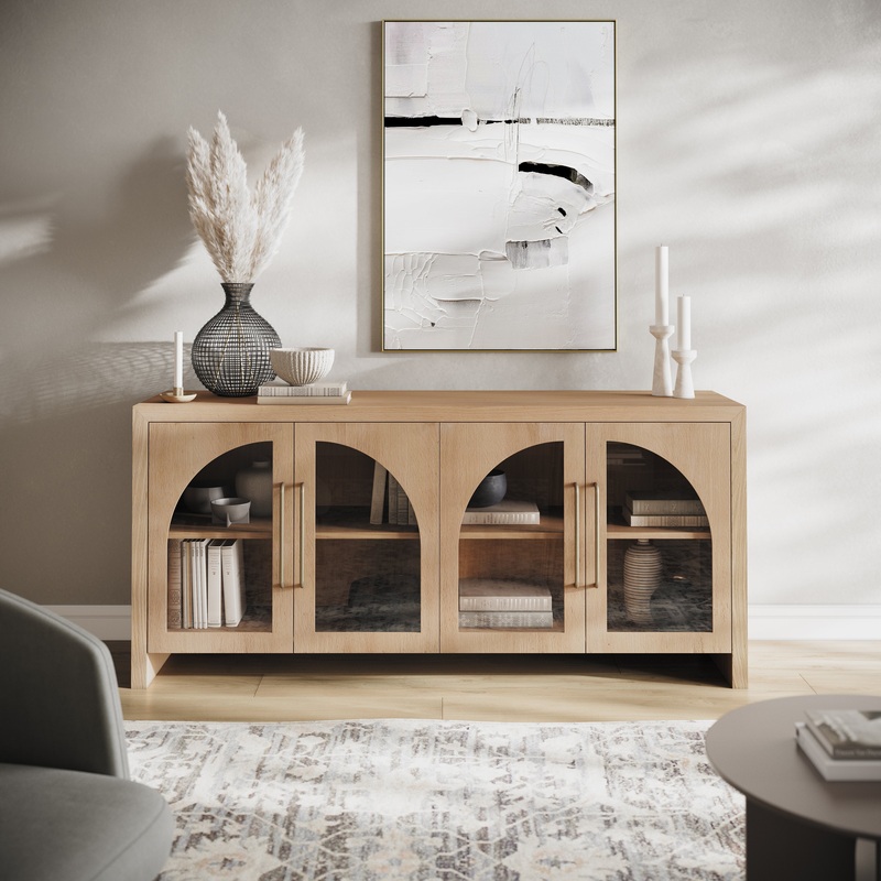 Jofran Archimedes Server offers architectural detail that adds character and sophistication to your space. The arched framing on the glass doors creates a visually appealing focal point. The glass doors provide a platform to showcase your treasured items, whether it’s decorative pieces, collectibles, or cherished mementos. The warm and contrasting wood interior of this piece adds depth and visual interest.