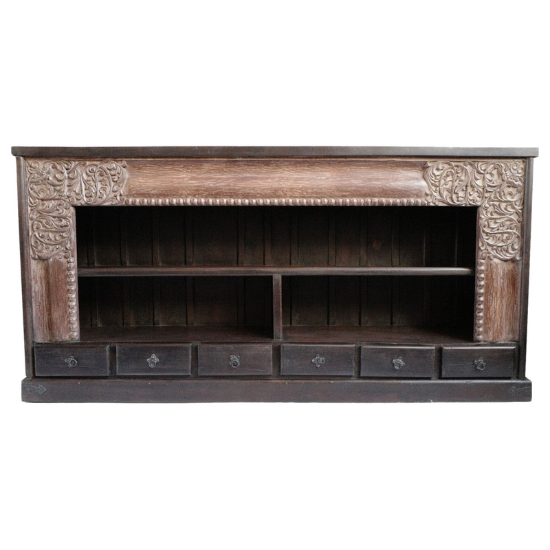 Architectural moulding framed bookcase shelf with six storage drawers below. Salvaged hand carved design on corners repurposed into a modern useful furniture piece. This item is non-returnable - all sales are final. Product ID130994311Manufactured ByDesign