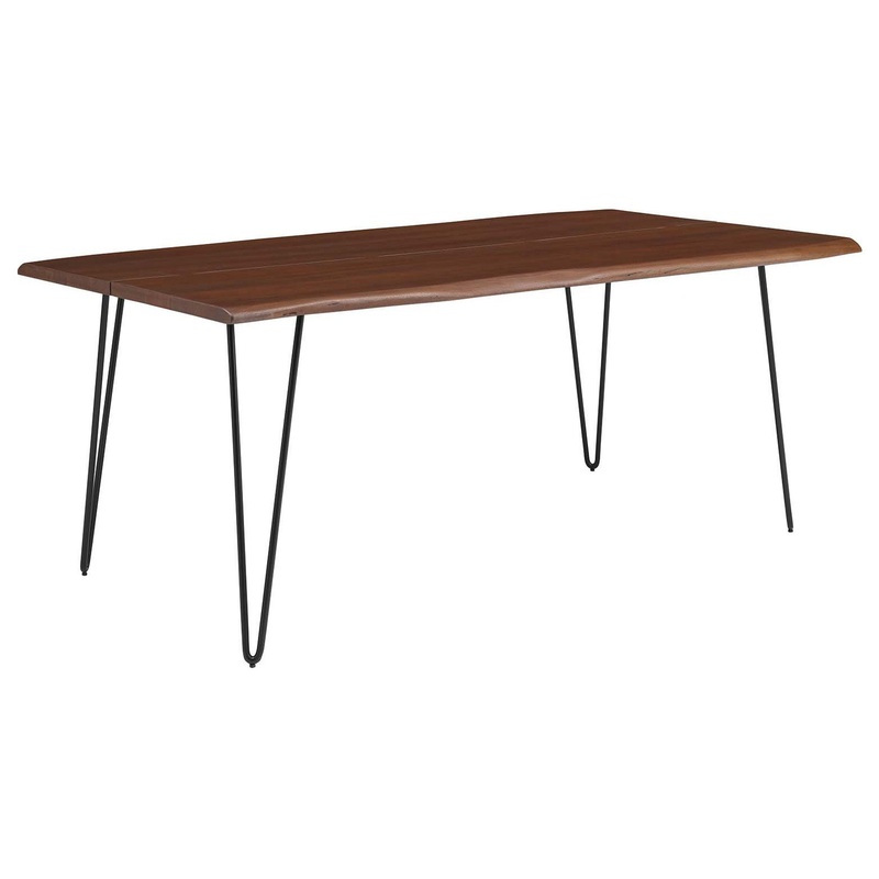 Incorporate organic intrigue to the dining space with the live wood edges of the Ardor Rectangular Dining Table. An eye-catching statement piece in the modern home or apartment, this one-of-a-kind dining table is crafted with solid planks of acacia wood joined together by butterfly joints. The live edge dining table rests on four powder-coated metal hairpin legs that bring mid-century aesthetics to dining room decor. Perfect for entertaining family and friends as well as everyday mealtimes, this spacious 74″ dining table effortlessly accommodates eight dining chairs. Due to the natural characteristics of the wood, each live edge table is unique. Includes non-marking foot pins to protect flooring. Assembly required.
