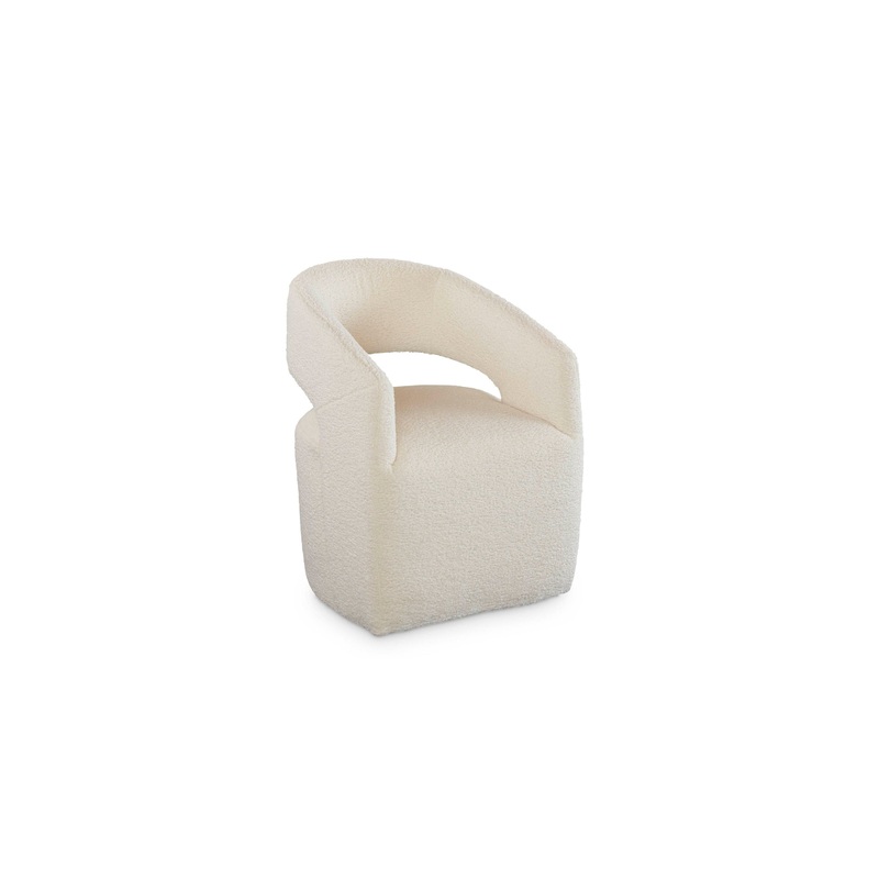The Aries upholstered dining chair is our unique take on a barrel chair, ready to cocoon you with the comfortable curve of wraparound back and arms. The Aries is completely upholstered in touchable, easy-care fabric to soften the look of your dining area. Choose from Cloud or Pearl performance fabric or Natural polyester shearling. Recessed casters allow for easy movement.