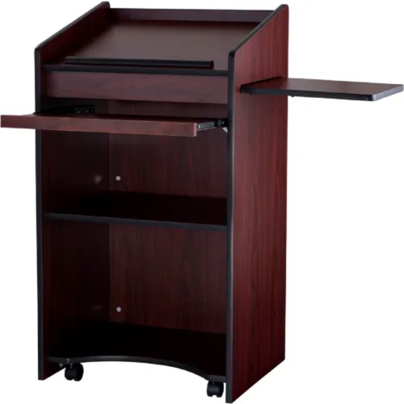The Model #600 Aristocrat is a bold, executive-style lectern ideal for conference, training, and formal meeting rooms. The high-quality cabinetry is of wood grain thermofused laminate, accented with attractive T-mold edging and features four concealed easy-roll casters (two locking) for smooth mobility. A side-mounted 16″ x 15″ slide-out shelf (35-lb. weight capacity) is at the presenter’s right side for A/V equipment or other presentation needs. The Aristocrat’s two built-in 23.5″ x 18″ shelves provide ample storage space. Ships ready for easy assembly.