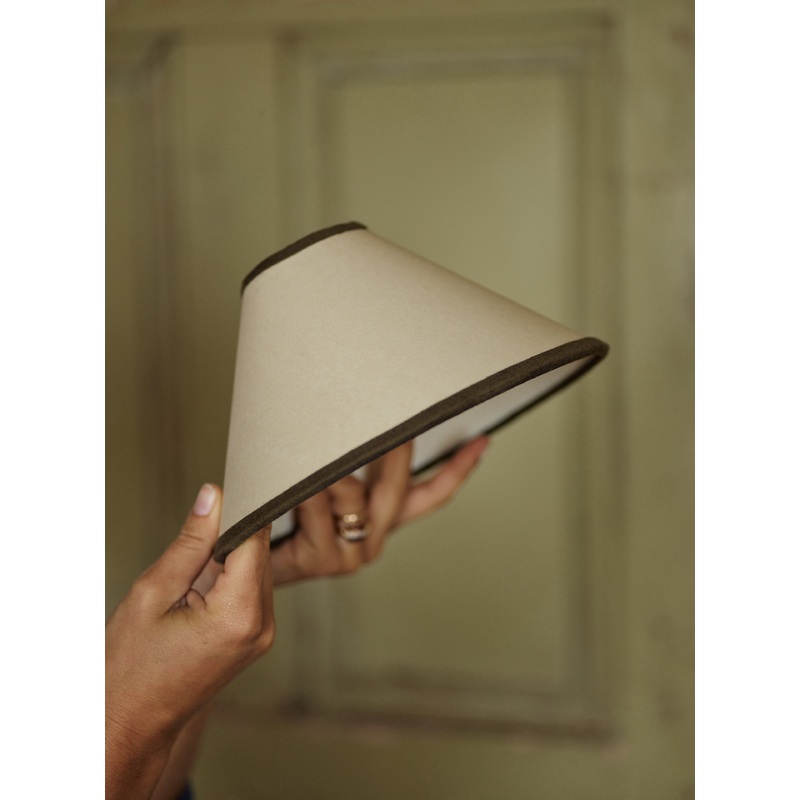 - A petite lampshadein understated card- Warm light diffuses gently through the subtle texture- Finished with a soft yet earthy olive trim in 100% cotton- Interlined with 100% natural toned cotton - Features an easy-to-use antiqued brass candle clip frame-