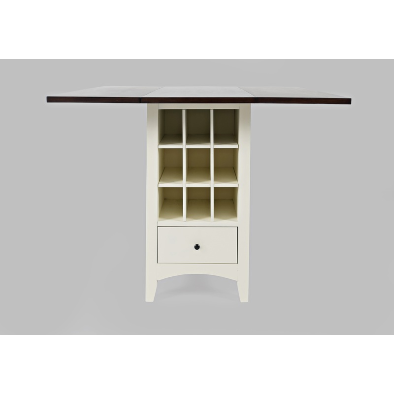 Clean lines and a classic silhouette with a two toned finish, the Asbury Park collection is available in both dining and counter height options. This drop leaf table features open wine storage and one drawer.