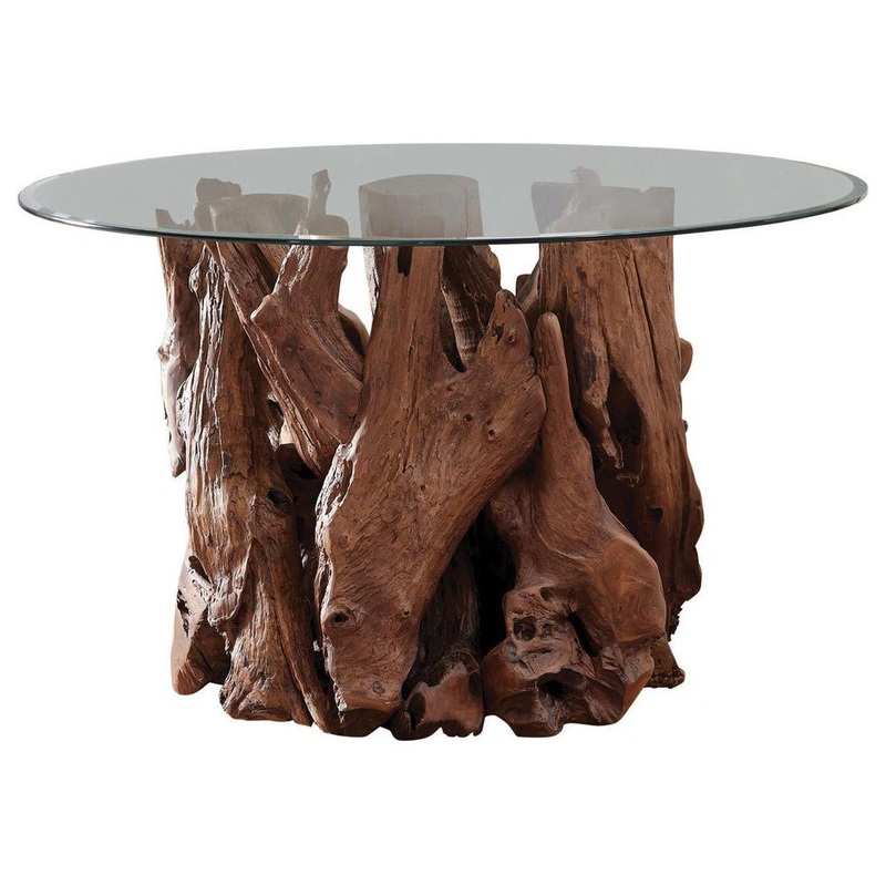 The beauty of nature comes indoors to create a distinctive look worthy of becoming a focal point in your modern space. This chic dining table offers a woodsy vibe with earth-centered aesthetics and an exotic personality. Embrace a base formed of natural light brown finish teak wood pieces emulating a driftwood-like collection straight from a forest or a beach. A round glass tabletop creates ultimate elegance with a contrasting style. Select coordinating chairs to make the most of an exceptional table fit for an upscale or casual space.