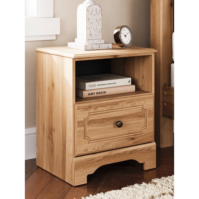 Country rustic. Vintage inspired. However you see it, youre sure to be charmed by this nightstand. Adorned with a chic drawer knob and a warm oak grain finish, it offers a relaxed mix of picturesque aesthetics. Its storage space gracefully welcomes bedside necessities. And built-in USB charging adds a dose of modern convenience, keeping your devices powered up from dusk to dawn. With an air of easygoing elegance, this piece lets you drift away to a simpler time and place.