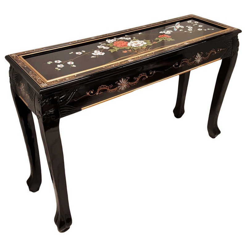 Our shiny forty four inch wide hand painted black lacquerware sofa table with bird and flower design makes the perfect addition to your home. This wooden console table is lacquered with multiple coats of lacquer to produce a mirror finish, then detailed and adorned with hand painting in blues, white, greens, and red colors. It comes with a protective glass top that covers the entire tabletop. The four legs are french curved, and the feet are hand carved with dragon claws. Gold line pencil moldings are use to frame this lovely art piece. We suggest using this against a wall with a stool underneath as an Asian desk or dressing table or behind a sofa with lamps. A great addition to any dining room, den, or office. Dimensions: 44 by 14 by 29 inches high.