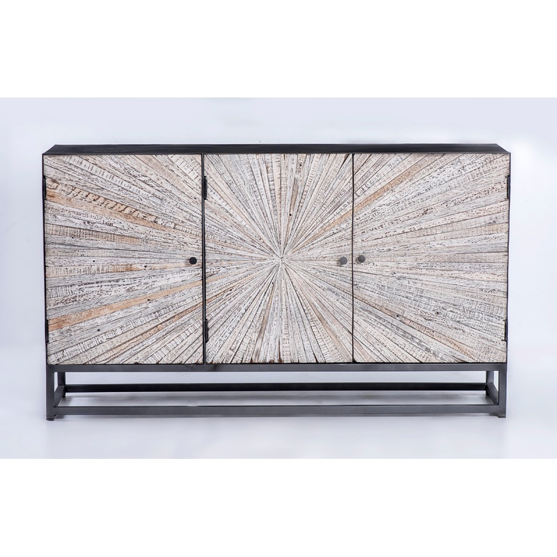 Eye-catching, the dramatic wood starburst pattern on the door fronts are masterfully cut and hand-placed to create an organic and textured look. This piece is balanced out with a grey surround and metal base. Features wire management and shelving behind three solid wood cabinet doors.