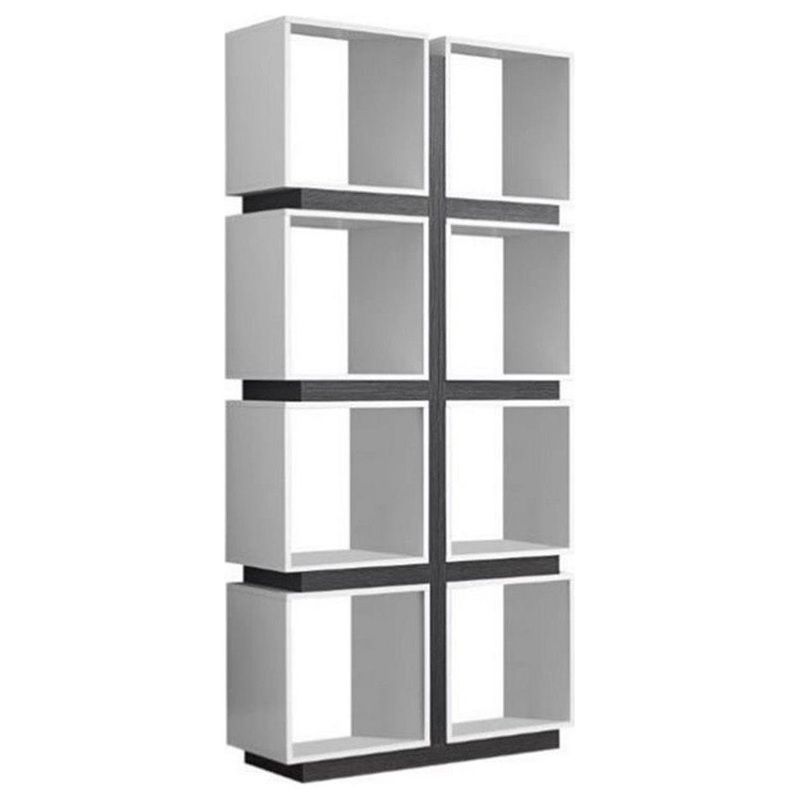 Give your home a modern art-deco look with this 8 cubic shelf bookcase. This perfectly symmetrical bookcase has 8 cubic spaces to showcase all your collectibles. With an open back, this piece can also be used as a room seperator. Featuring a Gray cedar finish and white shelves, this unit will be the focal point of any room.