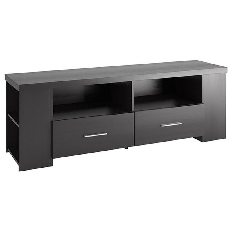 Refresh your home with this engaging combination of modern design and efficient storage space from the Atlin Designs. This contemporary TV Stand features a variety of storage solutions; dual storage drawers, open storage shelves and discrete side shelves ideal for CDs, DVDs and books. Organization never looked so good. Complete in our signature Ravenwood Black finish and designed to accommodate most TVs up to 75″.