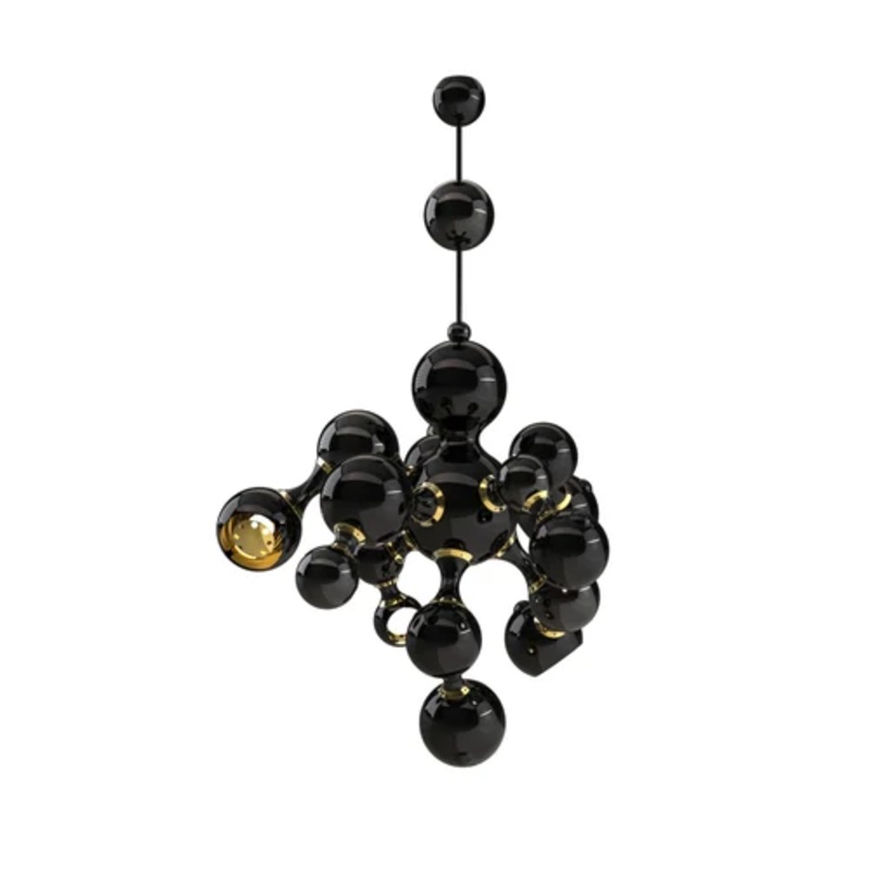 A contemporary descendant of retro sphere lighting, Atomic suspension lamp is a spot-on interpretation of the atomic age design. A set of glossy black and gold plated round shades, aligned by an asymmetric composition to enhance non-conventional molecular forms. As each shade evokes a petrifying effect, its ideal to be placed in a modern living room to surprise your guests, as well as in a modern lobby. A breathtaking design inspired in 50s legacy.