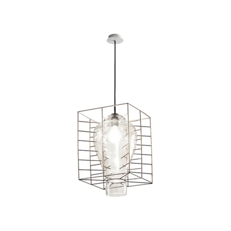 The molten glass ball, blown by the master craftsman, expands by modeling itself inside the metal cage without letting the rods pass through, for a suggestive visual result capable of stimulating the senses and thought. This lamp is a photographic sculpture, a snapshot of the unstable balance of blown glass, a Moment before breaking. It evokes his creation, his nature.