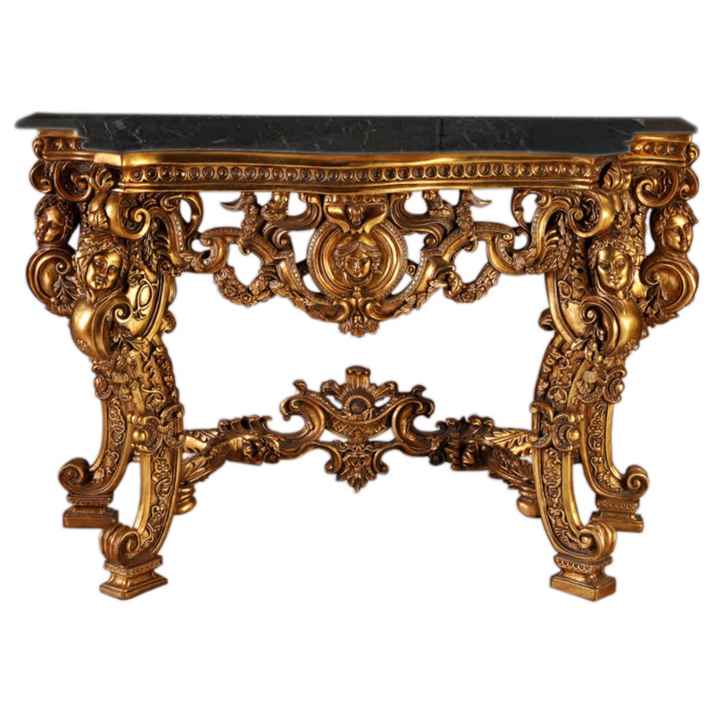 -Sure to be the focal point of any room, this lavish, antique gold console table with a marble top is the epitome of luxury. -Features beautiful intricate carvings and designs throughout. -Perfect for use with a vanity mirror.Model # (MPN)FON-110 Black Mar