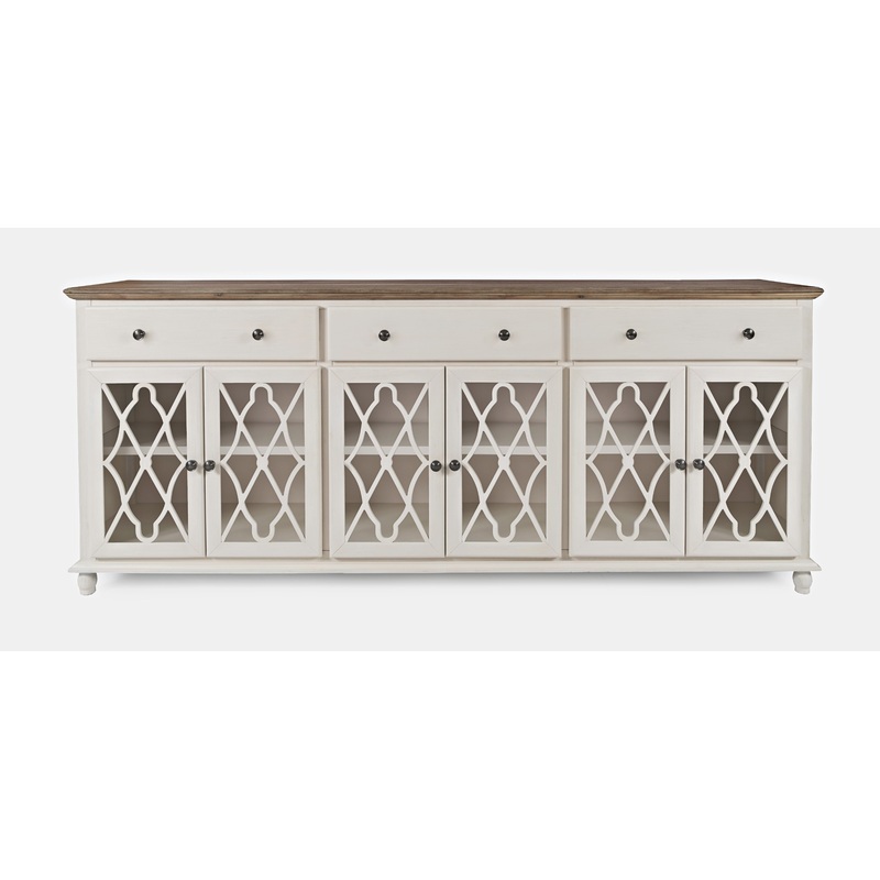 These versatile cabinets will be a stylish focal point anywhere in your home. Glass inlay doors with elegant fretwork and an alluring two toned finish, these cases feature three drawers and six glass doors with adjustable interior shelves.Features:Fully As