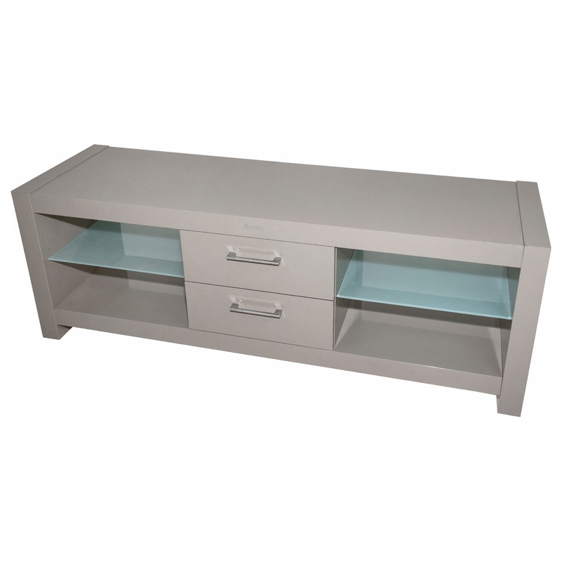 Defined by its glossy finish, AURORA TV stand instantly elevates your entertainment area in sophisticated style. Crafted of manufactured wood, this TV stand strikes a clean-lined rectangular silhouette. Glass shelving provide perfect platforms for your cable box, entertainment console, and audio equipment, while two deep drawers offer out-of-sight storage for audio/video accessories.